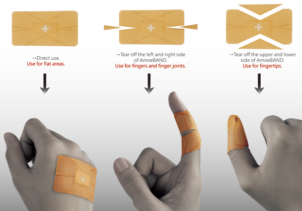 AmoeBAND is a design concept for a first aid bandage with a clever tear-away adjustable shape and an indicator that changes color if an infection is detected (video). The concept was created by design students at Shih Chien University in Taiwan.