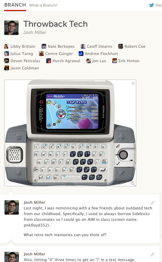Branch is an online discussion service that lets users have focused conversations with their friends, with less of the all-caps noise of typical online discussion (video). Users can start a discussion, or “branch,” with a link, tweet, or message, and invite people in their network to join the conversation. The branches are public (and can be embedded almost anywhere), but outsiders must request an invite to join the discussion. For an example, see this branch on childhood tech memories. The service is currently in public beta.