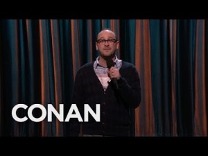 An enthusiastic father helps his young child experience some low-tech virtual reality by lifting them on a tricycle in front of a television playing first-person footage of a rider on a bicycle track. The man turns and shakes the tricycle to simulate turns and bumps along the track.
