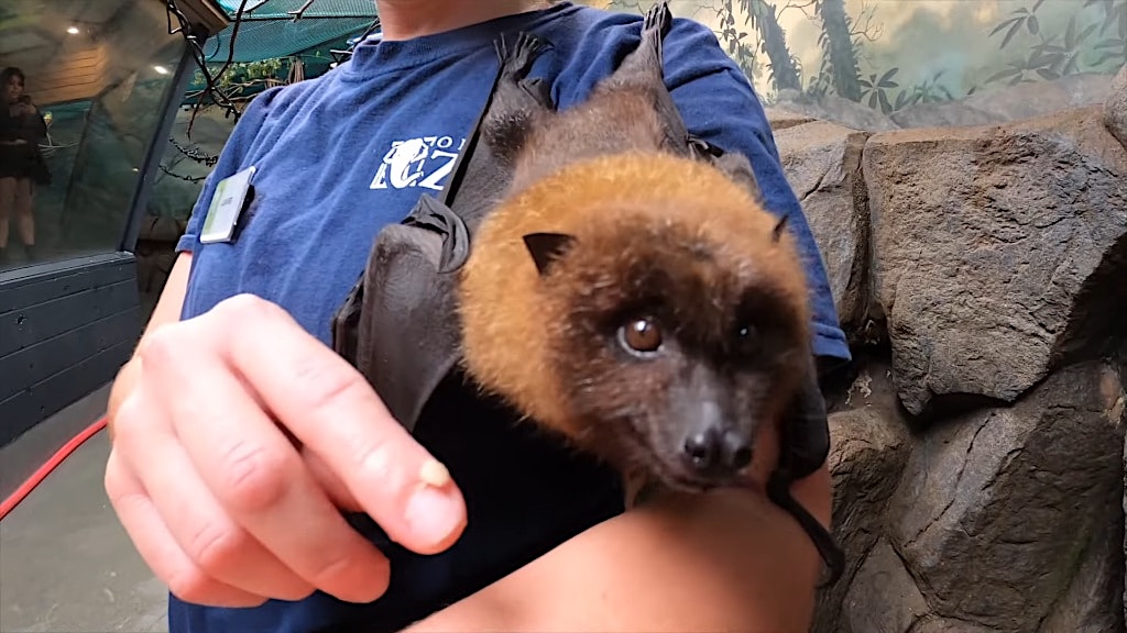 Happy Birthday Roxy! This tiny Rodrigues flying fox is a year old today. Care staff hand-reared Roxy after she was rejected by her mom.