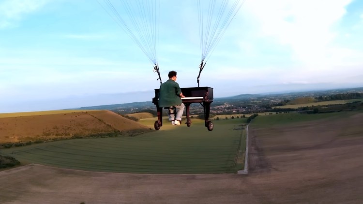 Musician Louis Cardozo performed his original song “Fly” on a paragliding piano flying over a very green valley in the English countryside. According to Cardozo, no special effects were used in the video.